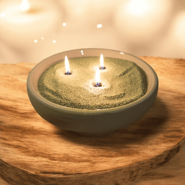 Contrairement aux bougies classiques, le sable ne se creuse jamais. Il reste parfaitement plat et scintillant, captant la lumière de la flamme pour un effet visuel spectaculaire.