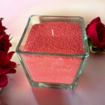 « Pour une mise en scène Haute Couture, disposez le sable Rouge Passion dans un contenant en verre transparent de grand diamètre ou dans une coupe en argent poli. Le contraste entre le rouge vibrant et l’éclat froid du métal créera un effet spectaculaire, tandis que le parfum de pomme d’amour apportera une âme chaleureuse à cet ensemble moderne. »